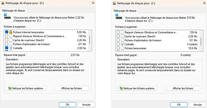- Coche toutes les cases proposées (fichiers temporaires, cache, corbeille…)